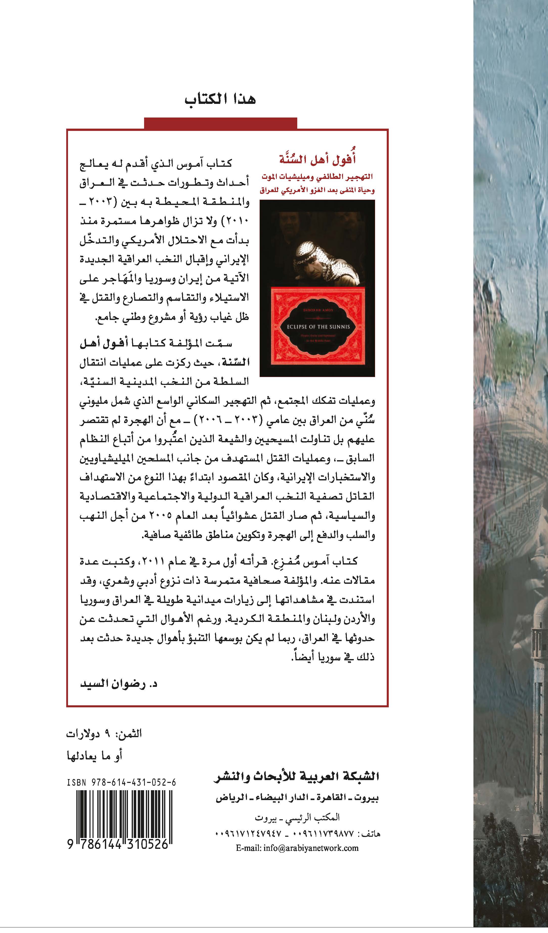 سمّت المؤلفة كتابها أفول أهل السّنة، حيث ركزت على عمليات انتقال السلطة من النخب المدينية السنيّة، وعمليات تفكك المجتمع، ثم التهجير السكاني الواسع الذي شمل مليوني سُنّي من العراق بين عامي (2003 – 2006) – مع أن الهجرة لم تقتصر عليهم بل تناولت المسيحيين والشيعة الذين اعتُبروا من أتباع النظام السابق -، وعمليات القتل المستهدف من جانب المسلحين الميليشياويين والاستخبارات الإيرانية، وكان المقصود ابتداءً بهذا النوع من الاستهداف القاتل تصفية النخب العراقية الدولية والاجتماعية والاقتصادية والسياسية، ثم صار القتل عشوائياً بعد العام 2005 من أجل النهب والسلب والدفع إلى الهجرة وتكوين مناطق طائفية صافية.