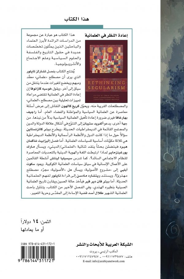 يفتتح الكتاب بفصل تشارلزتايلور الذي يرى أن مصطلح “علماني” معقد ومبهم ويخضع لتغيرات عندما ينتقل من سياق إلى آخر.ويقول خوسيه كازانوفا إن إعادة النظر في العلمانية تقتضي مراعاة تمييزات تحليلية بين مصطلح “العلماني” والمصطلحات القريبة منه. ويحوّلكريغ كالهون النقاش إلى عرض أسئلة معاصرة عن العلمانية السياسية والمواطنة والفضاء العام. أماراچيف بهارغافا فيرى ضرورة إعادة تأهيل العلمانية السياسية بدلاً من نبذها. من جهة أخرى، يدعوألفريد ستيبان إلى التنوع في أشكال علاقة الدولة والدين والمجتمع القائمة في الديمقراطيات الحديثة، ويطرحبيتر كاتزنستاين سؤالاً حول ما إذا كانت الدول والأنظمة الرأسمالية والأنظمة الديمقراطية هي ثلاثة مكونات أساسية للسياسات العلمانية. أما فصل إليزابيثشاكمانهيرد فيتضمن بحثاً ينقد ثنائية “العلماني/الديني”. ويسأل مارك يورغينزماير لماذا ارتبطت اللغة والهوية الدينية بالتحديات المعاصرة للنظام الاجتماعي السائد؟. كماتدرس سيسيليا لينتش أنشطة القائمين على الأعمال الإنسانية في سياق سياسات العلمانية الكوكبية.ويعود سكوت آبلبي إلى “مشروع الأصولية” ويسأل هل “الأصولية” مجرد مصطلح مهترئ؟.ويستند ريتشارد مادسن إلى قراءةتايلور لفهم العلمانية الحديثة. أما بيتر فان دير فير فيأخذ حالة الصين ويقارن تاريخ العلمانية الصينية بنظيره الهندي. وفي الفصل الأخير من الكتاب، يتناول باحث العلمانية الشهير طلال أسد قضية الإساءة إلى المقدس وحرية التعبير.