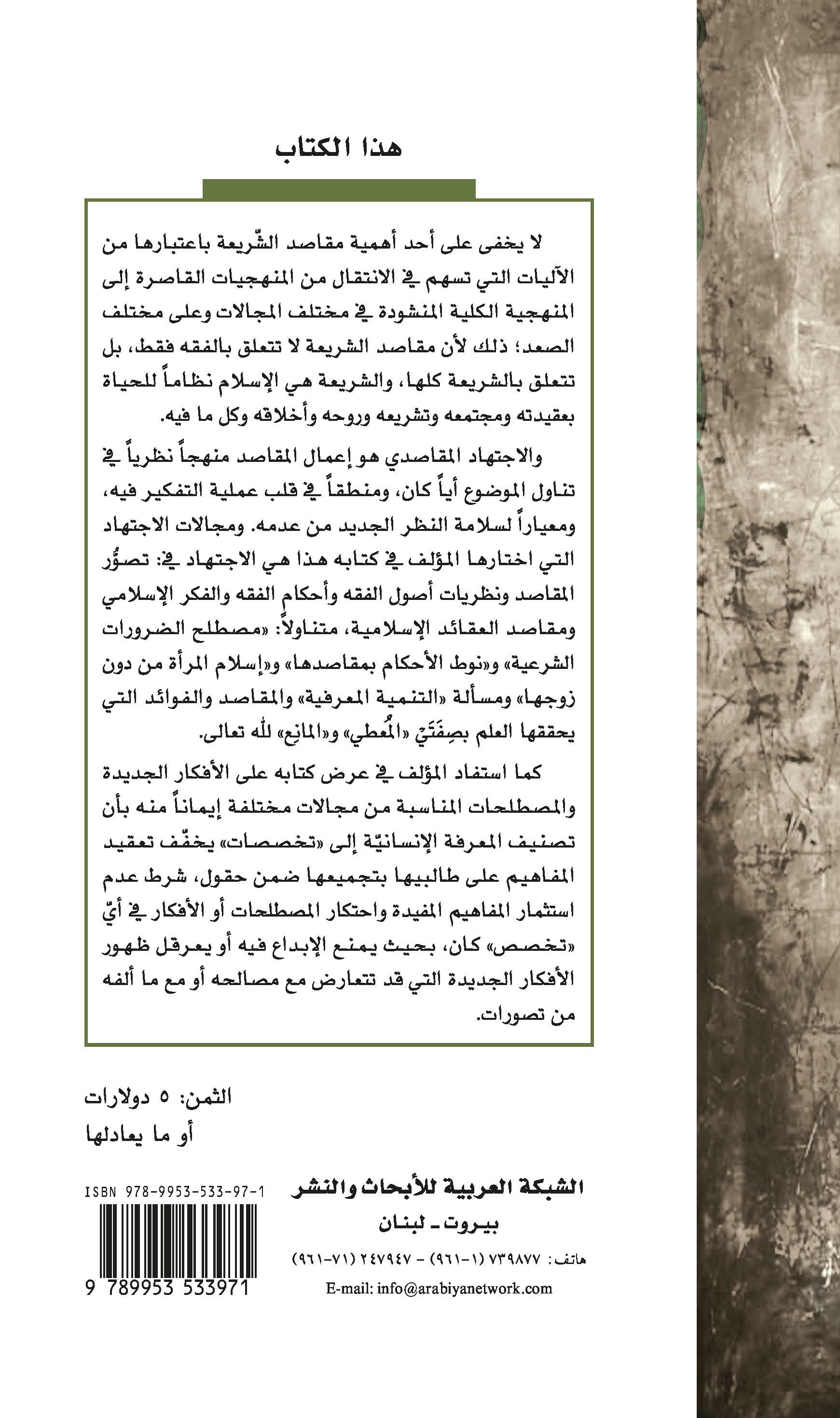 والاجتهاد المقاصدي هو إعمال المقاصد منهجاً نظرياً في تناول الموضوع أياً كان، ومنطقاً في قلب عملية التفكير فيه، ومعياراً لسلامة النظر الجديد من عدمه، ومجالات الاجتهاد التي اختارها المؤلف في كتابه هذا هي الاجتهاد في: تصوّر المقاصد ونظريات أصول الفقه وأحكام الفقه والفكر الإسلامي ومقاصد العقائد الإسلامية، متناولاً: “مصطلح الضرورات الشرعية” و”نوط الأحكام بمقاصدها” و”إسلام المرأة من دون زوجها” ومسألة “التنمية المعرفية” والمقاصد والفوائد التي يحققها العلم بصفتيْ “المُعطي” و”المانع” لله تعالى.