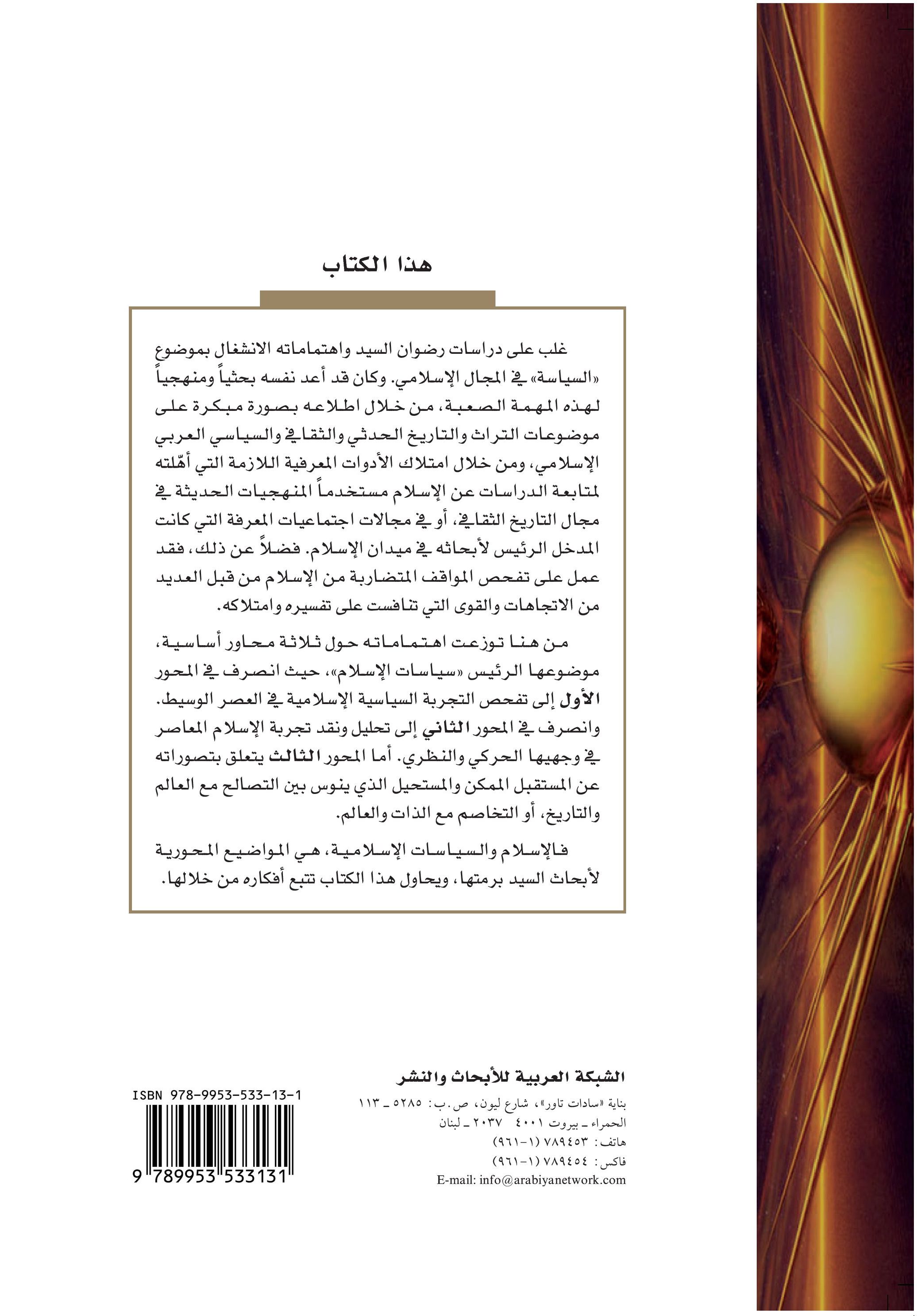 من هنا توزعت اهتماماته حول ثلاثة محاور أساسية، موضوعها الرئيس «سياسات الإسلام»، حيث انصرف في المحور الأول إلى تفحص التجربة السياسية الإسلامية في العصر الوسيط. وانصرف في المحور الثاني إلى تحليل ونقد تجربة الإسلام المعاصر في وجهيها الحركي والنظري. أما المحور الثالث يتعلق بتطوراته عن المستقبل الممكن والمستحيل الذي ينوس بين التصالح مع العالم والتاريخ، أو التخاصم مع الذات والعالم. فالإسلام والسياسات الإسلامية، هي المواضيع المحورية لأبحاث السيد برمتها، ويحاول هذا الكتاب تتبع أفكاره من خلالها.