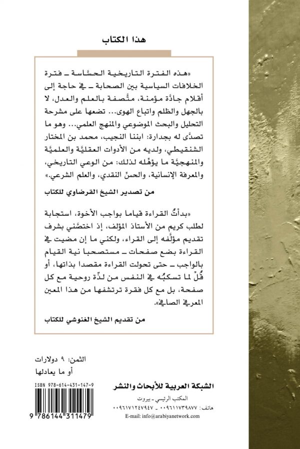 “هذه الفترة التاريخية الحسَّاسة – فترة الخلافات السياسية بين الصحابة – في حاجة إلى أقلام جادَّة مؤمنة، متَّصفة بالعلم والعدل، لا بالجهل والظلم واتباع الهوى… تضعها على مشرحة التحليل والبحث الموضوعي والمنهج العلمي… وهو ما تصدَّى له بجدارة: ابننا النجيب، محمد بن المختار الشنقيطي، ولديه من الأدوات العقليَّة والعلميَّة والمنهجيَّة ما يؤهِّله لذلك: من الوعي التاريخي، والمعرفة الإنسانية، والحسِّ النقدي، والعلم الشرعي.” (من تصدير الشيخ القرضاوي للكتاب).