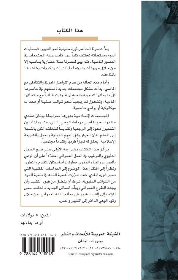 يركز هذا الكتاب بالدرجة الأولى على قيم العمل الدنيوي والترغيب في العمل العمراني مشدداً على أن الوعي بالعمران والبناء الفكري خطوتان أساسيتان للتقدم والتطور ونظراً إلى افتقار هذا الموضوع إل الدراسات الفقهية التي تسبر غوره المادي فقد تعززت أهمية الفقه في تنقية الفرد من الشوائب الدنيوية شرط أن ينطلق من قيود التقليد وأن يجدد الطرح العمراني ويولد المسائل الجديدة لذلك سعى المؤلف إلى إلقاء الضوء على معالم الفقه العمراني من خلال وقود الوعي الدافع إلى التغيير والعمل