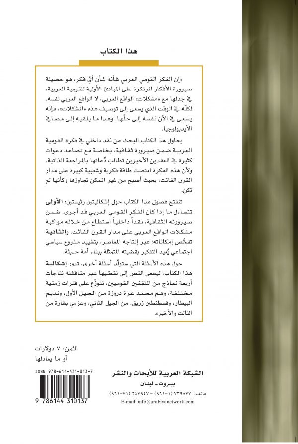 تنفتح فصول هذا الكتاب حول إشكاليتين رئيسيتين : الأولى تتساءل ما إذا كان الفكر القومي العربي قد أجرى ضمن صيرورته الثقافية نقداً داخلياً استطاع من خلاله مواكبة مشكلات الواقع العربي على مدار القرن الفائت والثانية تفحص إمكاناته عبر إنتاجه المعاصر بتشييد مشروع سياسي اجتماعي يعيد التفكير بقضيته المتمثلة ببناء أمة حديثة
