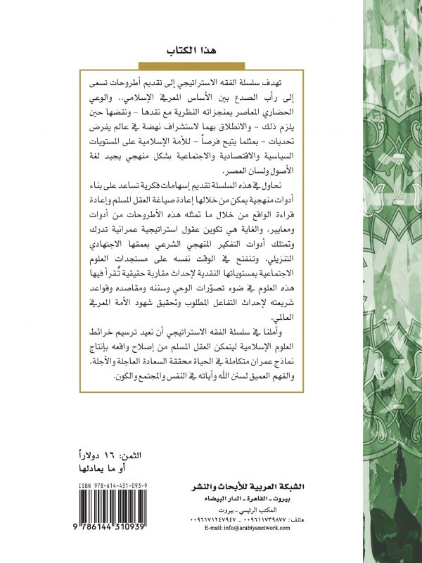 تهدف سلسلة الفقه الاستراتيجي إلى تقديم أطروحات تسعى إلى رأب الصدع بين الأساس المعرفي الإسلامي..والوعي الحضاري المعاصر بمنجزاته النظرية مع نقدها- ونقضها حين يلزم ذلك-والانطلاق بهما لاستشراف نهضة في عالم يفرض تحديات –بمثلما يتيح فرصاً – للأمة الإسلامية على المستويات السياسية والاقتصادية والاجتماعية بشكل منهجي يجيد لغة الأصول ولسان العصر.